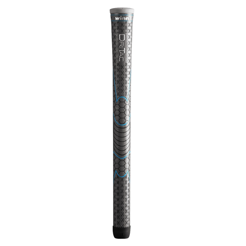 This ladies' or undersize Dri-Tac grip has a cushioned, comfortable feel and remains tacky in all weather conditions. It has a light gray color with striking blue paint lines and a stylish grey end cap.