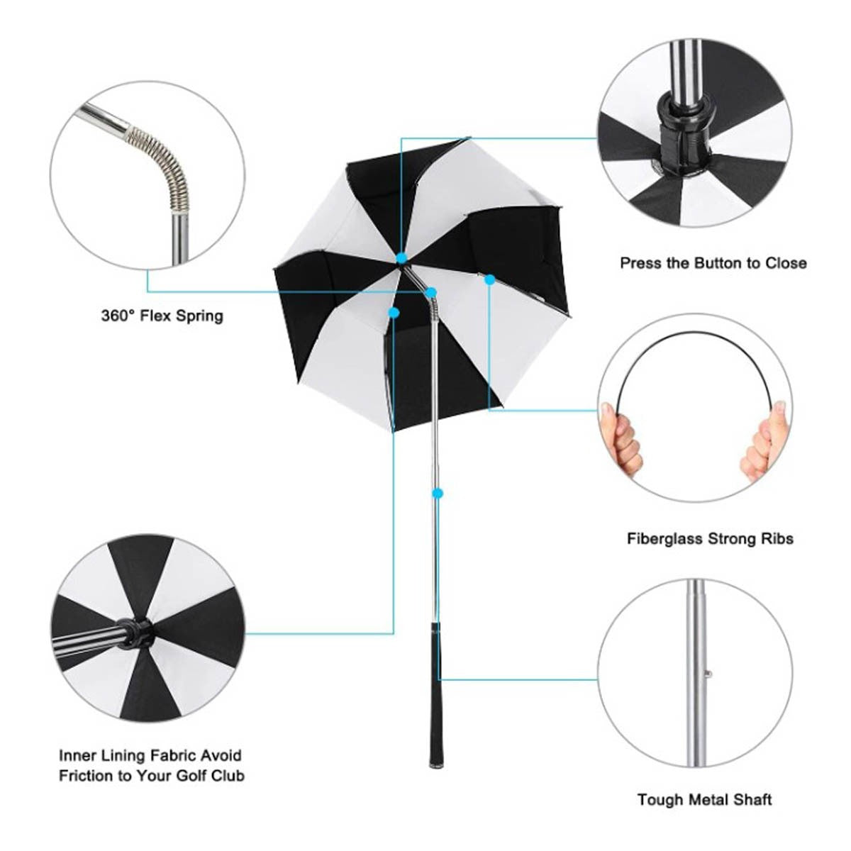 Keep your clubs dry with this flexible club umbrella. The Club Canopy Golf Bag Umbrella features a flexible shaft to allow even easier access to your clubs in the harshest weather conditions!