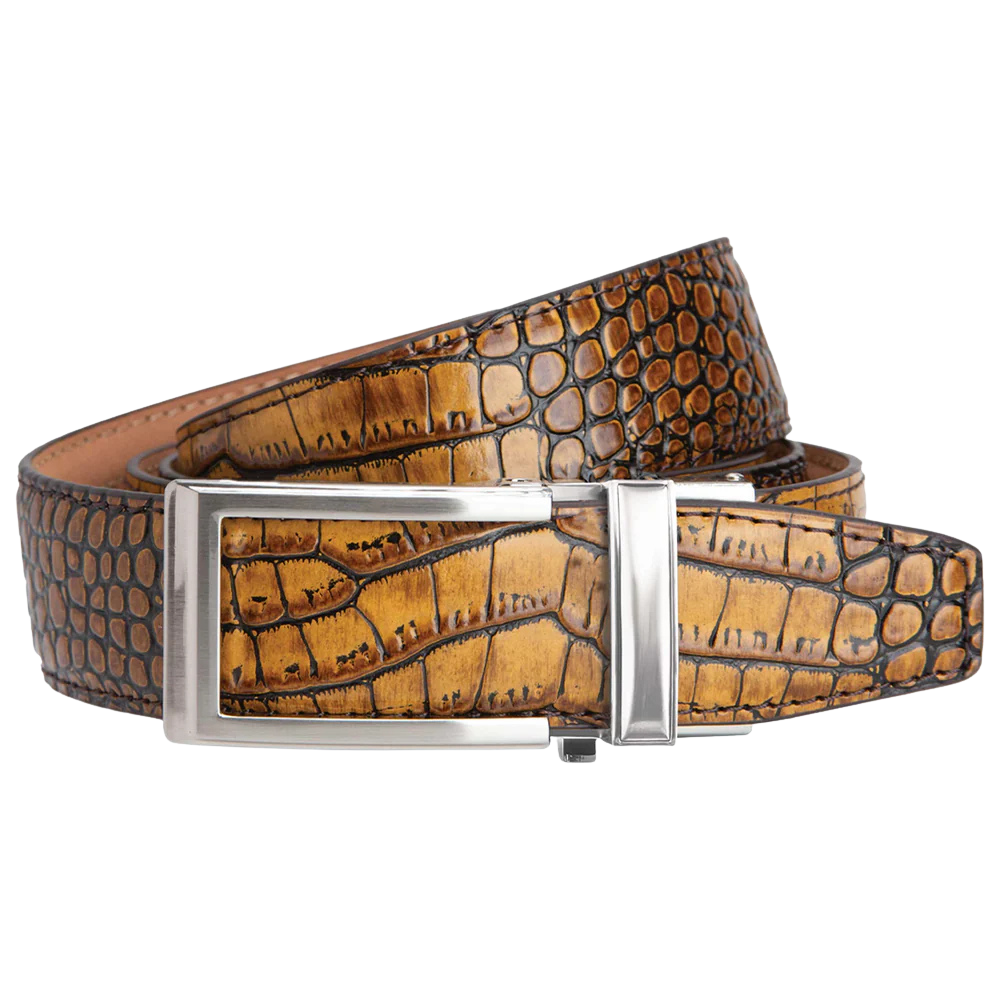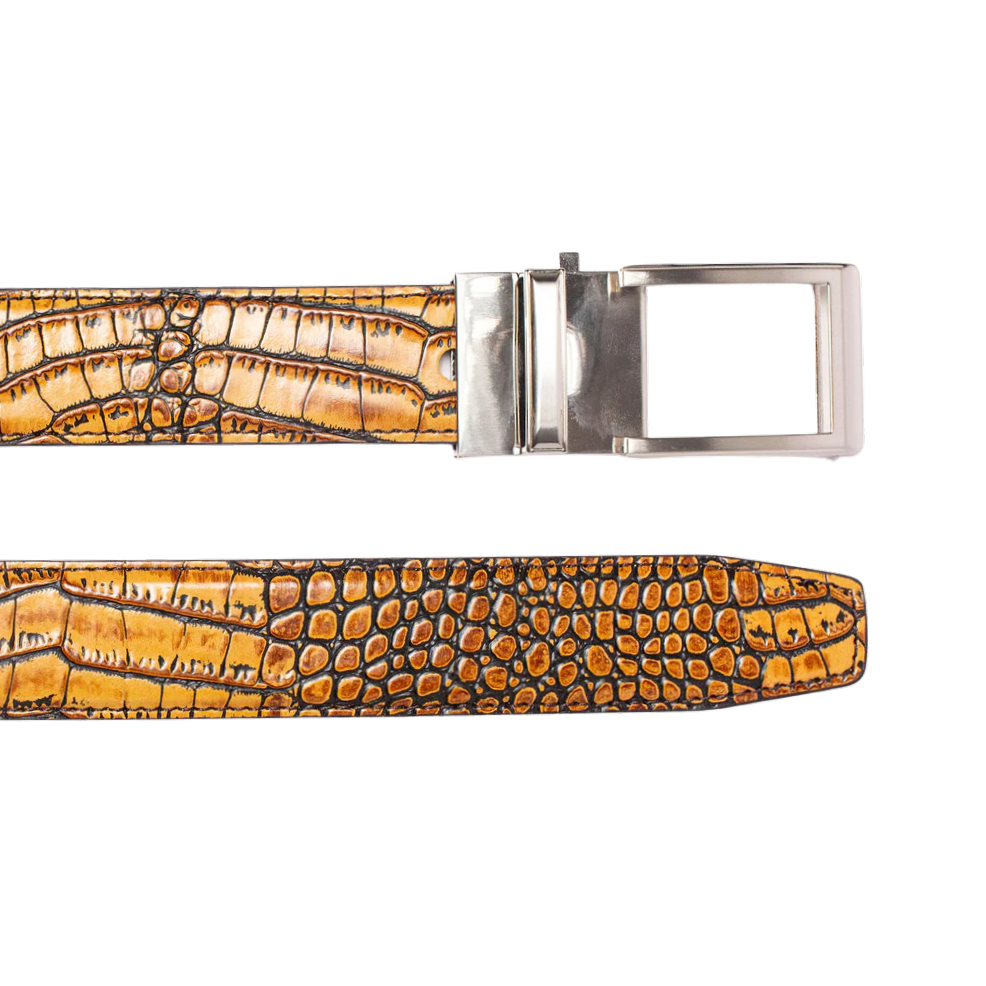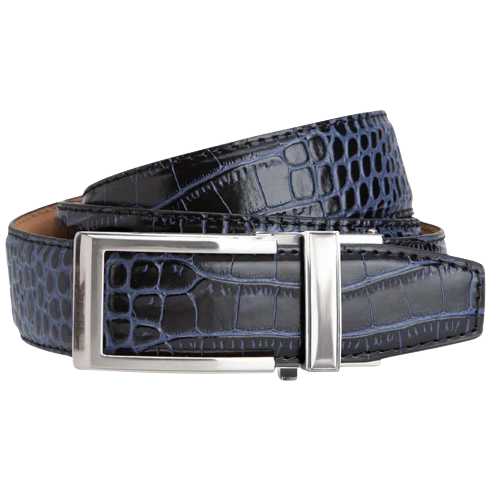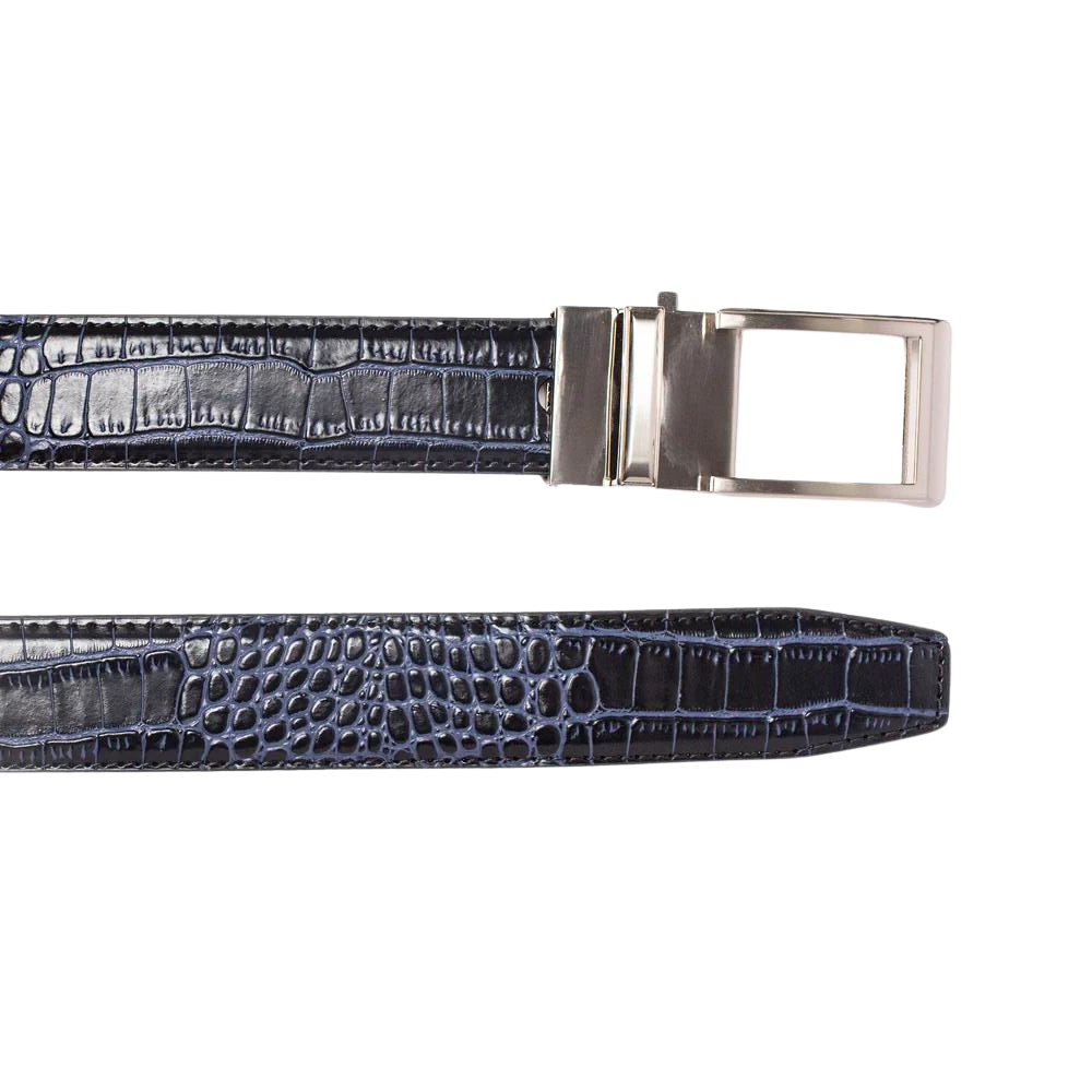 Elevate your style with our newest Cayman Black & Blue Ratchet belt. Experience unmatched comfort with our cutting-edge aerospace-grade aluminum push-button buckle, reducing weight by 40%. Our innovative ratchet technology and patented scaling system ensure supreme comfort and versatility. The unique mock caiman embossed texture adds a luxurious touch, perfect for any occasion, from golfing to casual hangouts. Discover the improved Cayman Black & Blue Ratchet belt for the ultimate style and comfort. Elevate your look and confidence with our high-quality belt that will turn heads.