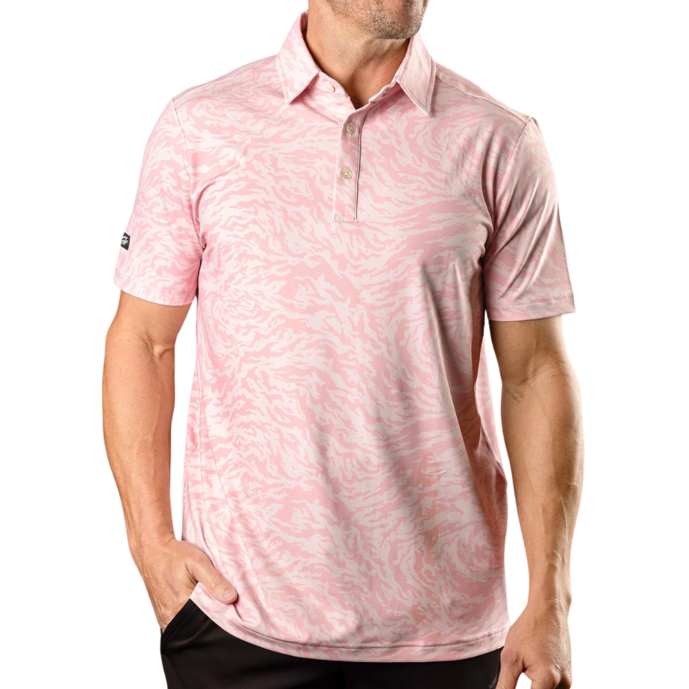 Not your average basic. Calm blues and grays are always a classic but at Sunday Swagger we like to mix things up. This desert blush color polo is understated and interesting with it's swirling sandstorm pattern.