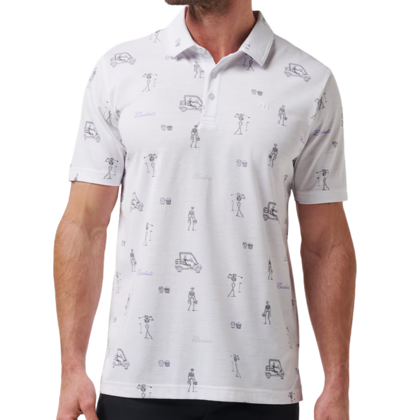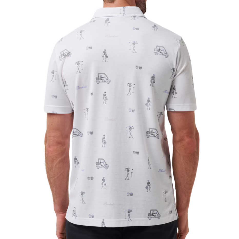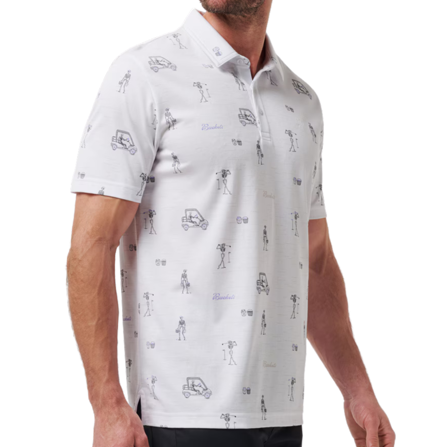 Skeletons on the green? We’re in. The LOST CITY Polo features an all-over print of skeletons golfing alongside our classic buckets graphic, combining playful energy with wearable style.