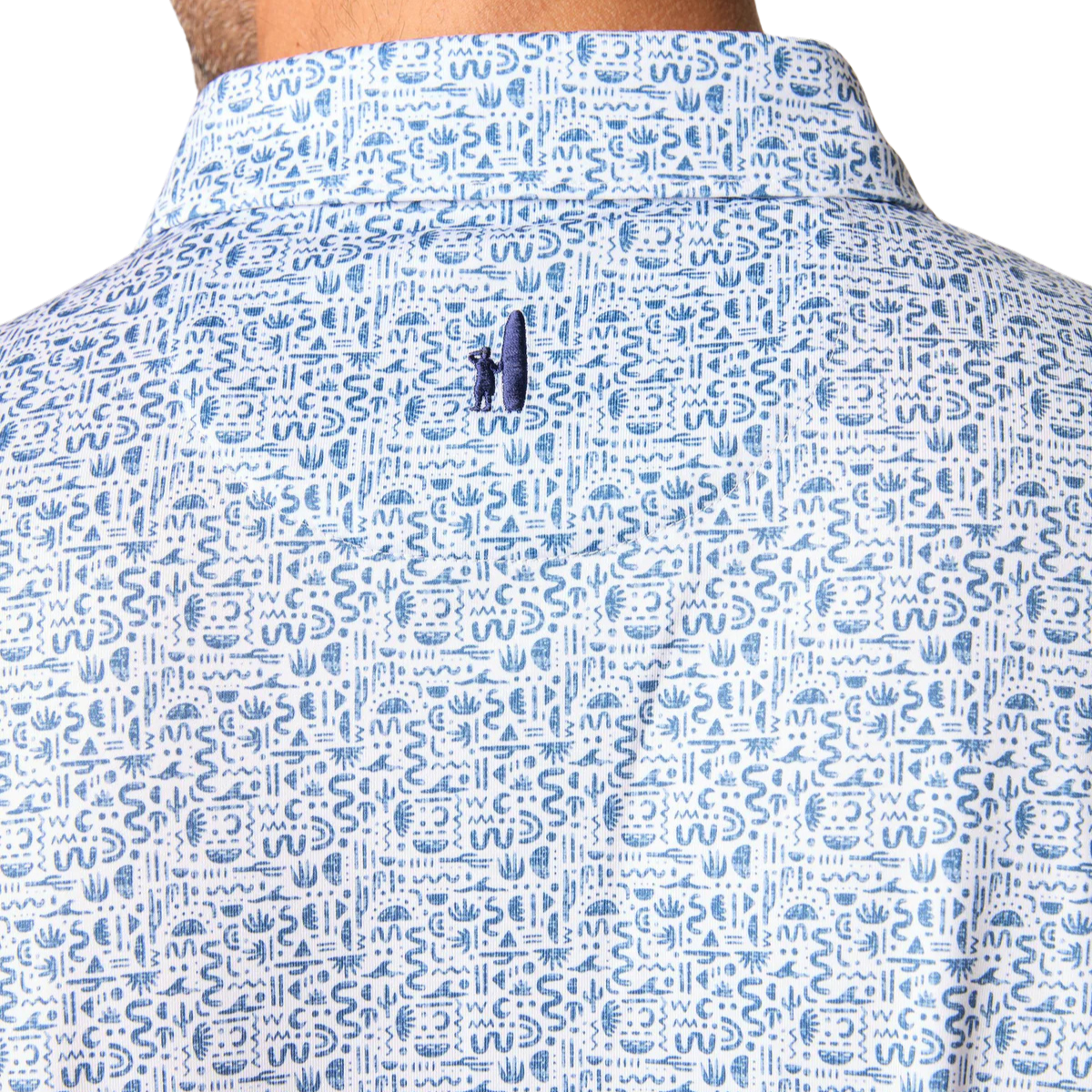 Our classic performance jersey polos are designed to be worn before, during and after the best round you've ever had. Made with a lightweight, moisture-wicking fabric with a comfortable touch of stretch (that also protects with UPF 50), they're a staple in every closet. Our Lynny Polo features a south-west inspired print in a cool navy colorway that's great for any round.