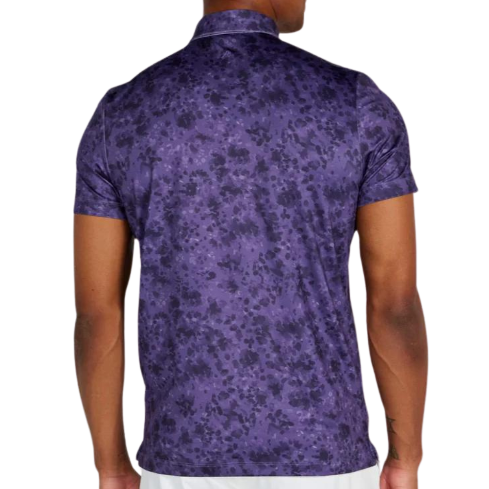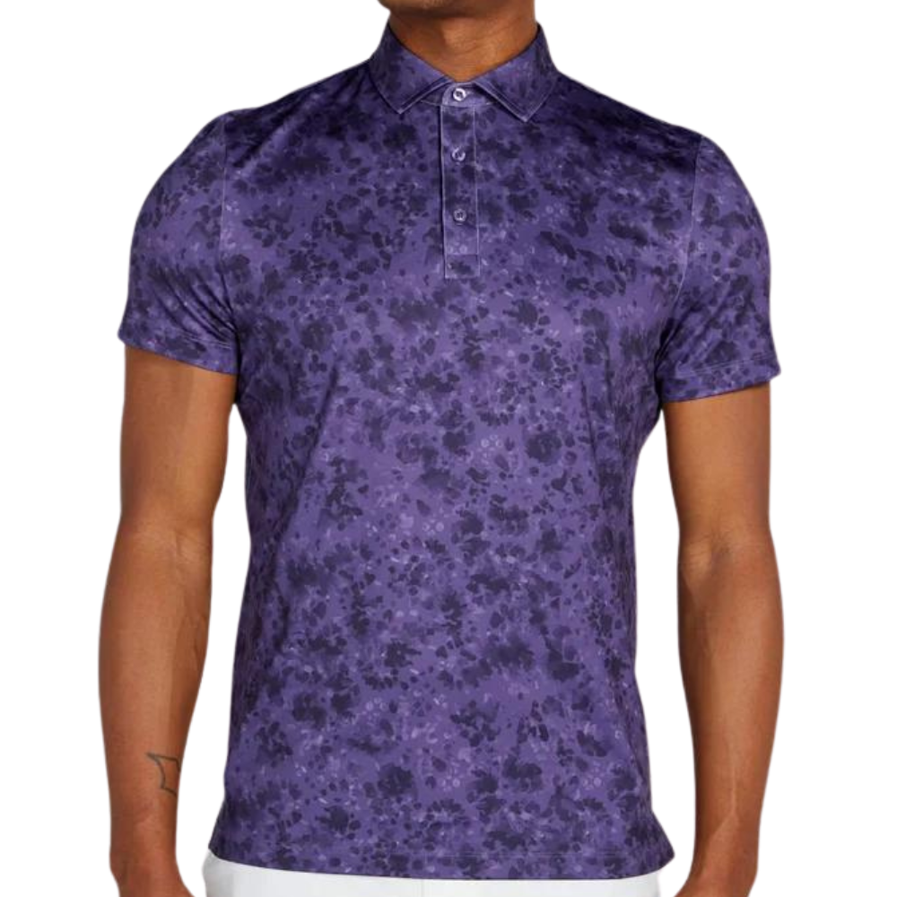 The Surry Polo shows certitude with its concentrated splatter motifs in deepended color tones. Spread self collar and 3 button placket front closure.