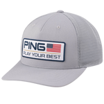 The PING Tour logo, an American flag and our longstanding encouragement to Play Your Best pop inside a large woven patch on this structured trucker mesh cap. The mesh makes for easy on/off, and the hat is 97% polyester to ensure durability and lasting quality. An adjustable snapback closure ensures one size will fit most.