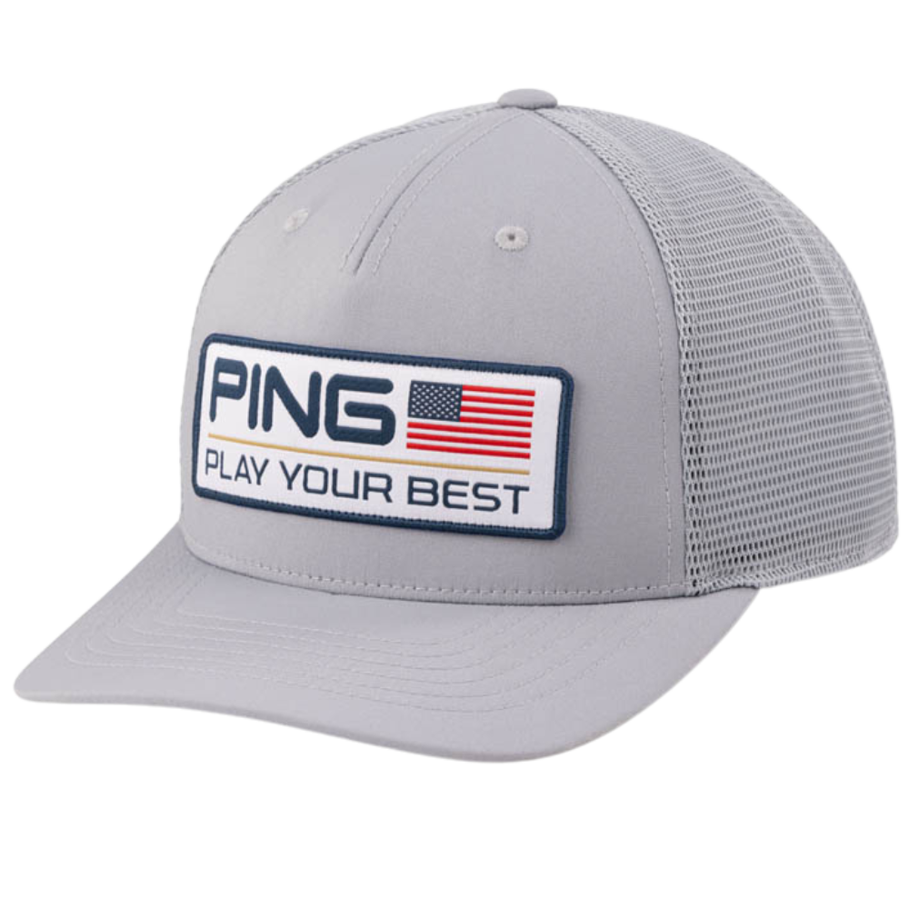 The PING Tour logo, an American flag and our longstanding encouragement to Play Your Best pop inside a large woven patch on this structured trucker mesh cap. The mesh makes for easy on/off, and the hat is 97% polyester to ensure durability and lasting quality. An adjustable snapback closure ensures one size will fit most.