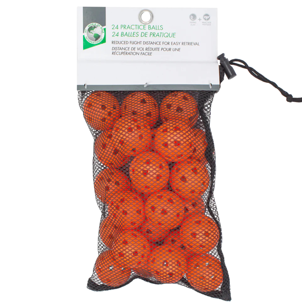 The World of Golf Practice Balls are durable so they can withstand the pressure and impact of a full golf swing. These plastic golf balls not only simulate the flight of a real golf ball but are also the same size as a real golf ball making it the ideal practice ball to perfect your full contact swing. Looking for practice balls both for indoor or outdoor use? The World of Golf Practice Balls' aerodynamic structure provides a limited flight distance making them easier to retrieve.