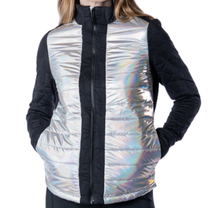 - Textured jacquard fabric with iridescent woven quilting down the front.