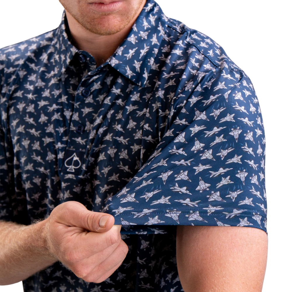 Take flight with the Birds of Steel polo, featuring an all-over print of F-22 Raptors in mid-maneuver against a deep navy sky.