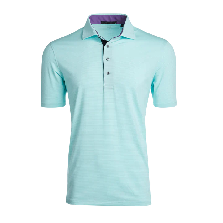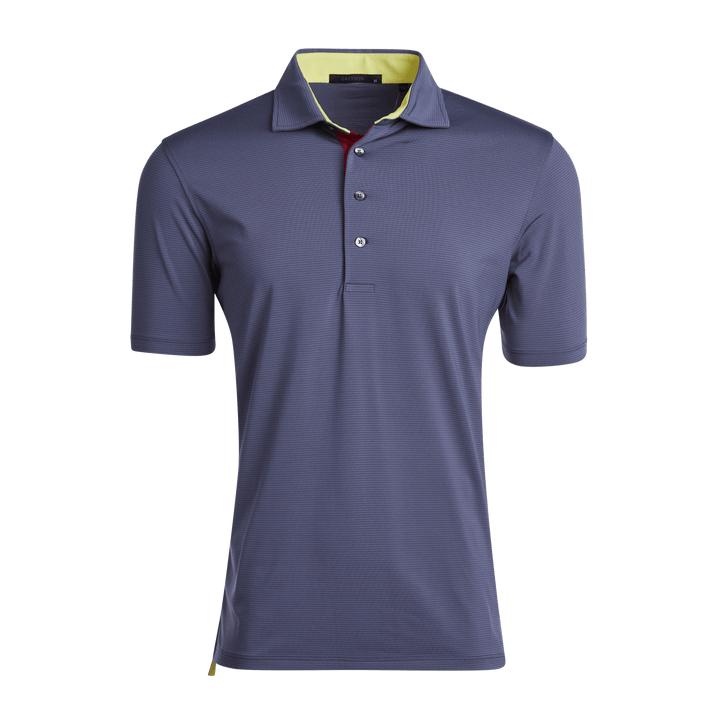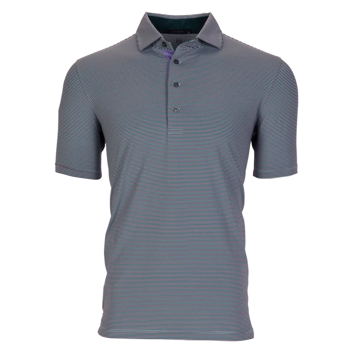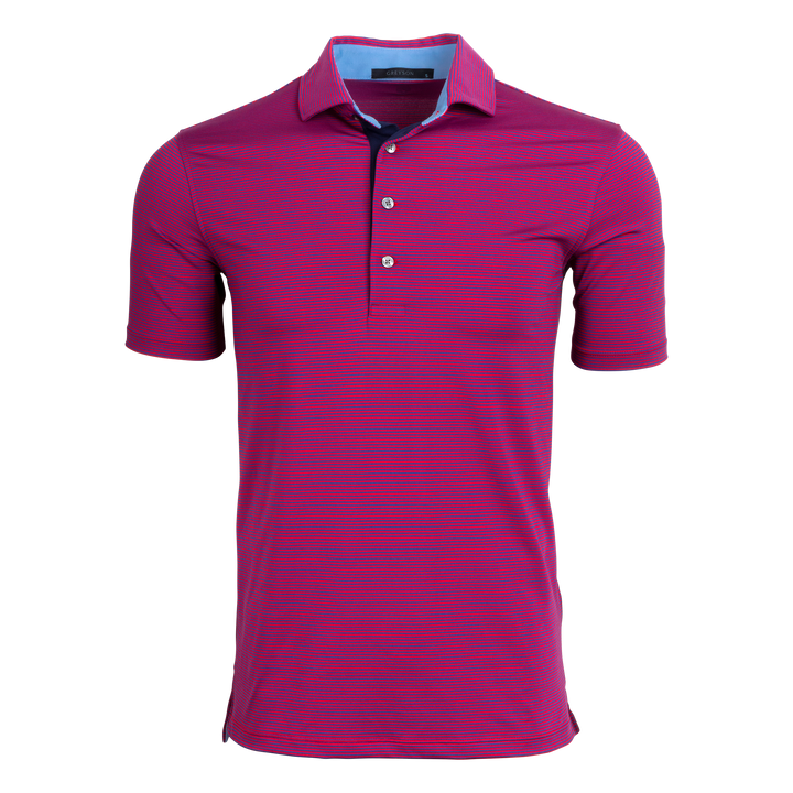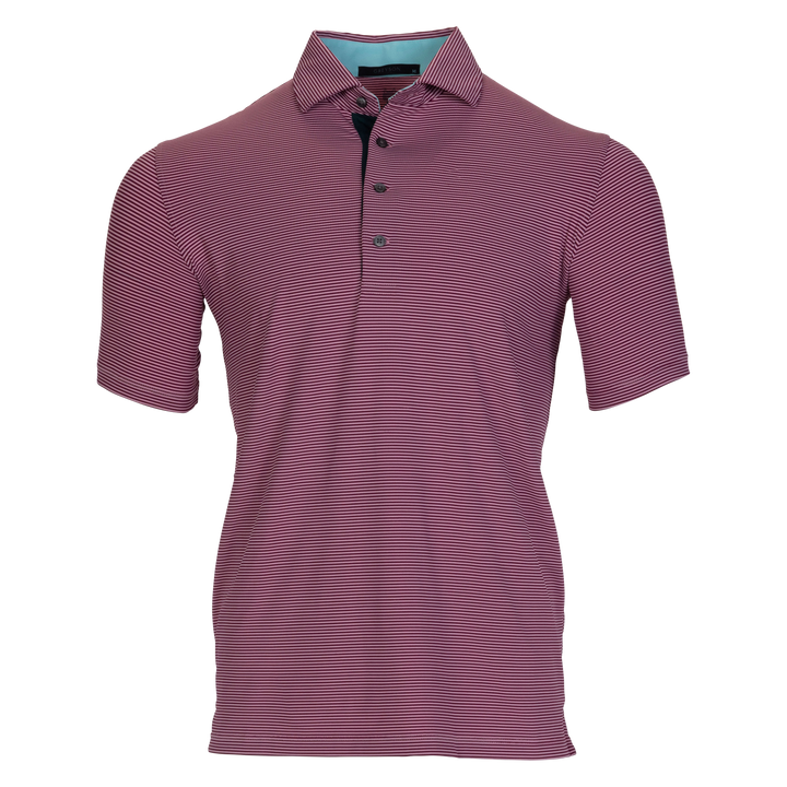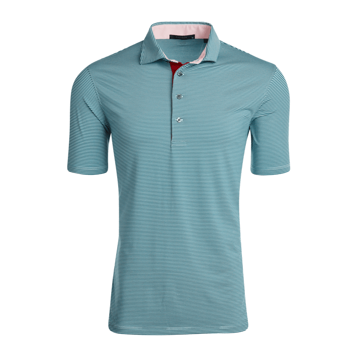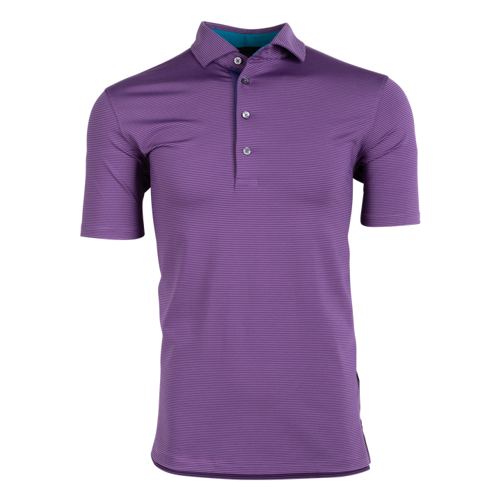 The perfect mini-feed stripe golf polo with a four-button placket featuring a bold pop of color on the neck and placket. Made from a blend of poly/spandex fabric and finished with a sateen wash to create a silky smooth feel, this polo was designed for the golf course and beyond.
