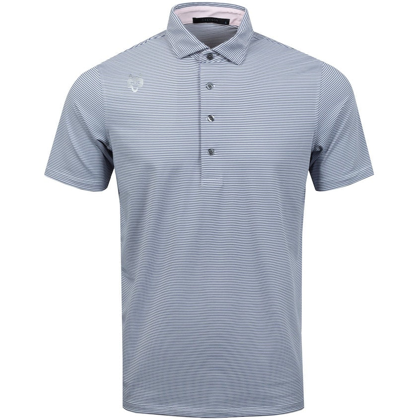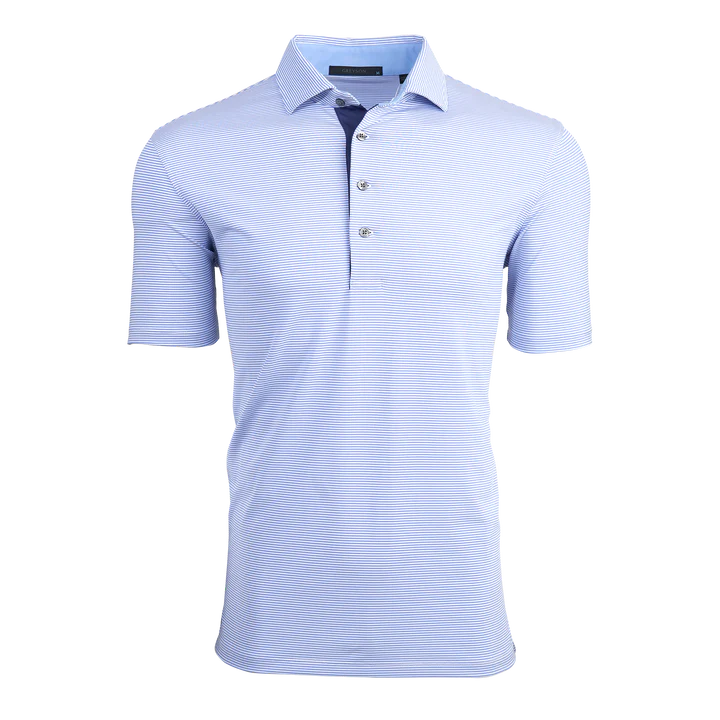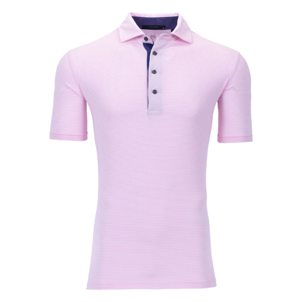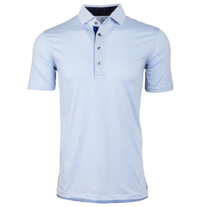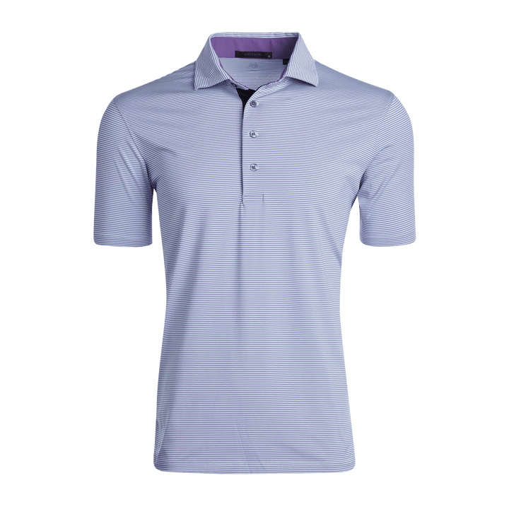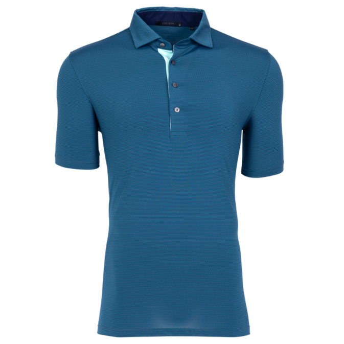 The perfect mini-feed stripe golf polo with a four-button placket featuring a bold pop of color on the neck and placket. Made from a blend of poly/spandex fabric and finished with a sateen wash to create a silky smooth feel, this polo was designed for the golf course and beyond.