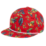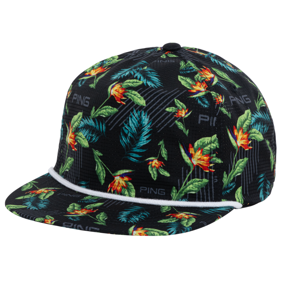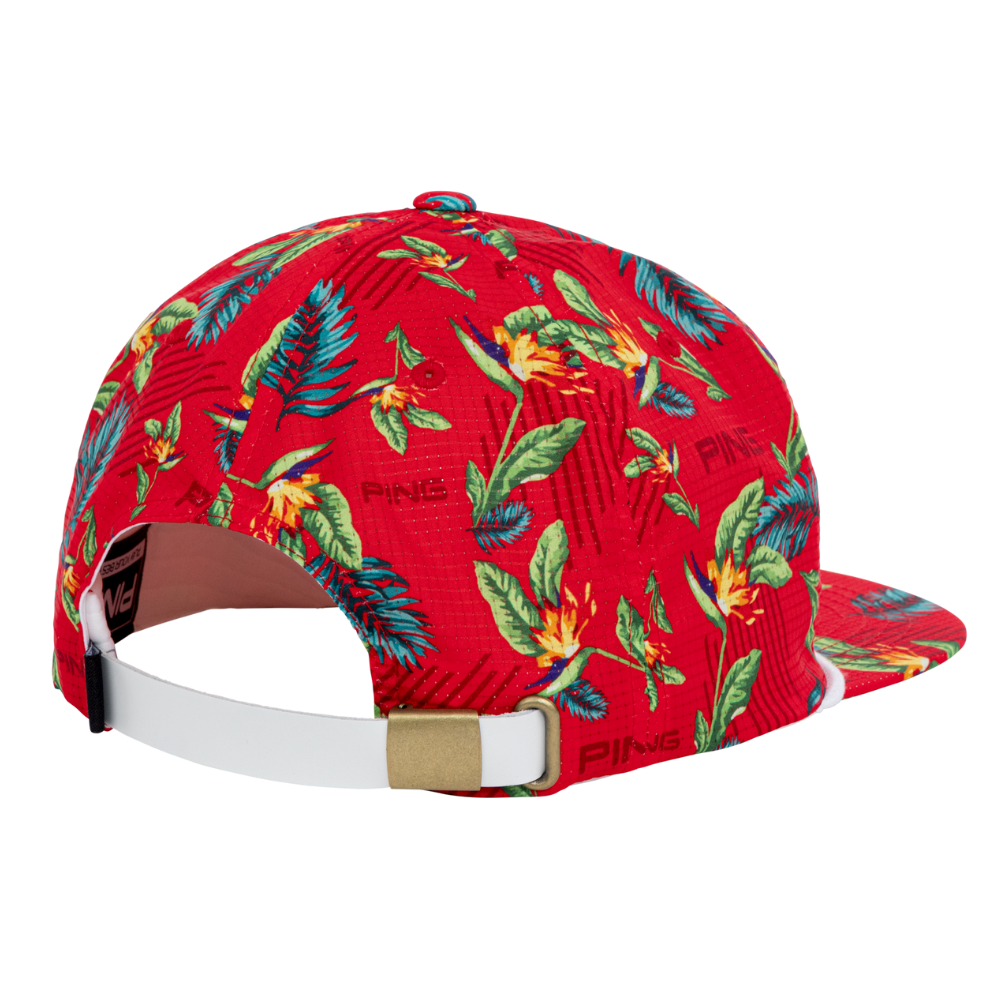 The Resortist conveys a casual sophistication with its bright arrangement of flora and fauna on a cap with a flat roped bill. Sublimated PING logos mingle with palm fronds and birds of paradise. Its 100% polyester fabrication means it will provide lasting quality, and it features a leather strap with a side closure to fit most.