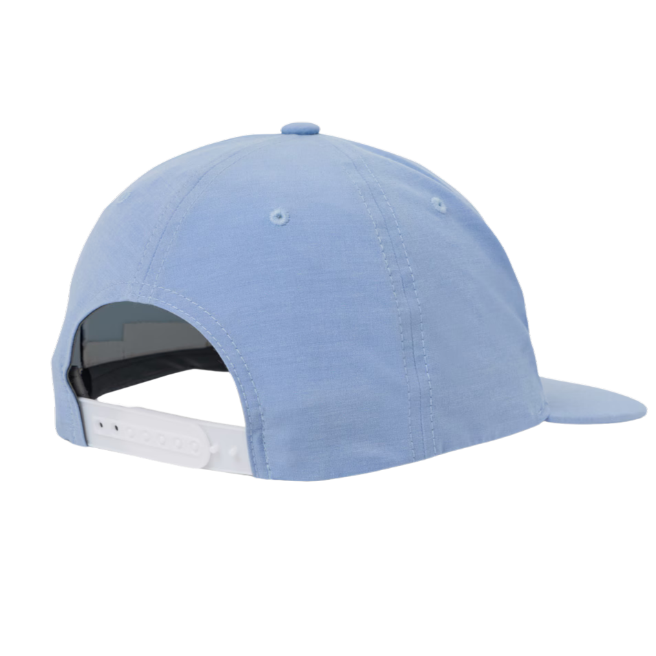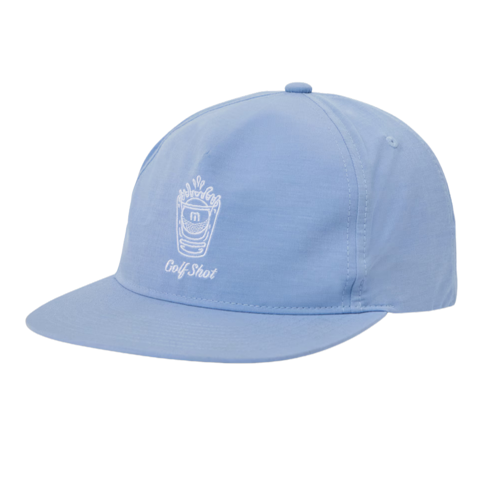 This hat walks in like it owns the place. BACK AGAIN is a semi-structured snapback featuring a flat-embroidered shot glass golf graphic—because sometimes the best rounds are the ones after the course. Topped off with a custom TravisMathew block logo snap closure and made from recycled materials, it’s a hat you’ll want on repeat.