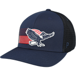 Classic trucker fit with a silicone based flying eagle and moisture wicking sweatband.