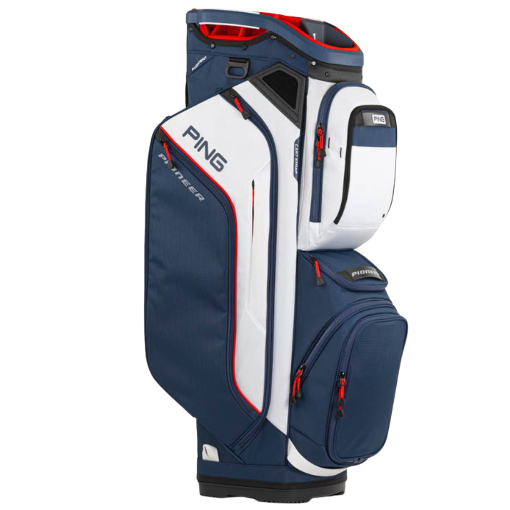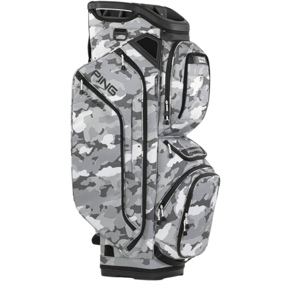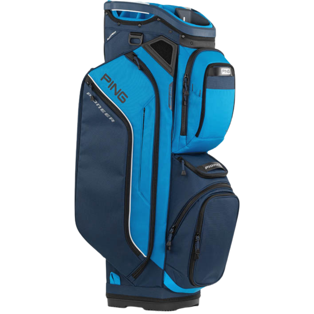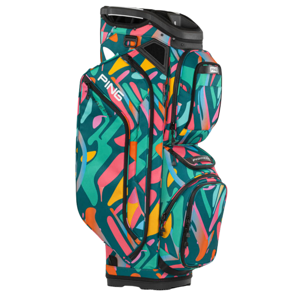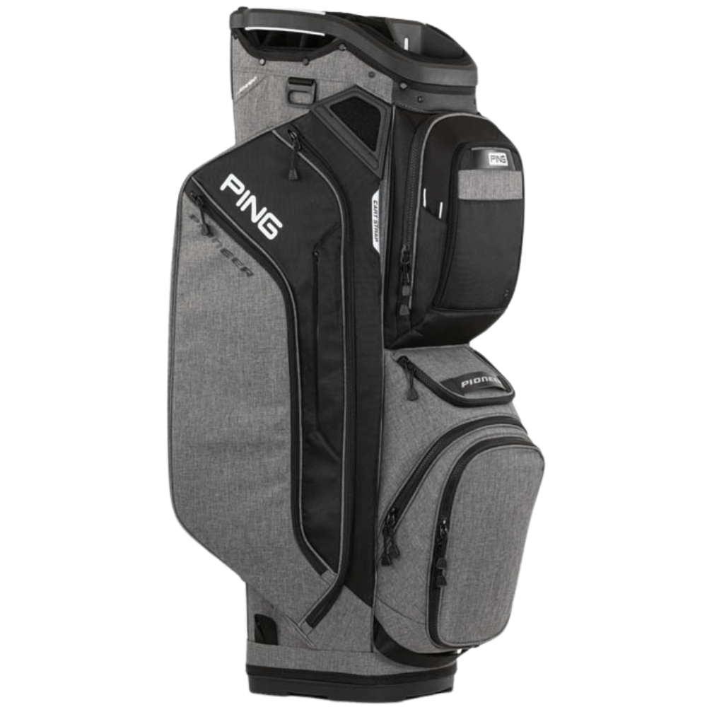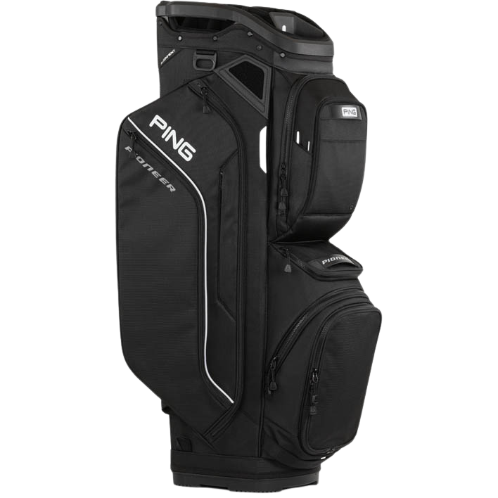 Featuring sixteen pockets that offer a massive thirty-five liters of storage volume, the PING Pioneer Cart Bag accommodates everything you want to bring to the course and more. A redesigned fifteen-way top with a larger putter well protects and organizes your clubs, while a cart-strap channel ensures all pockets remain accessible when riding.