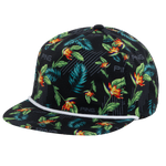 The Resortist conveys a casual sophistication with its bright arrangement of flora and fauna on a cap with a flat roped bill. Sublimated PING logos mingle with palm fronds and birds of paradise. Its 100% polyester fabrication means it will provide lasting quality, and it features a leather strap with a side closure to fit most.